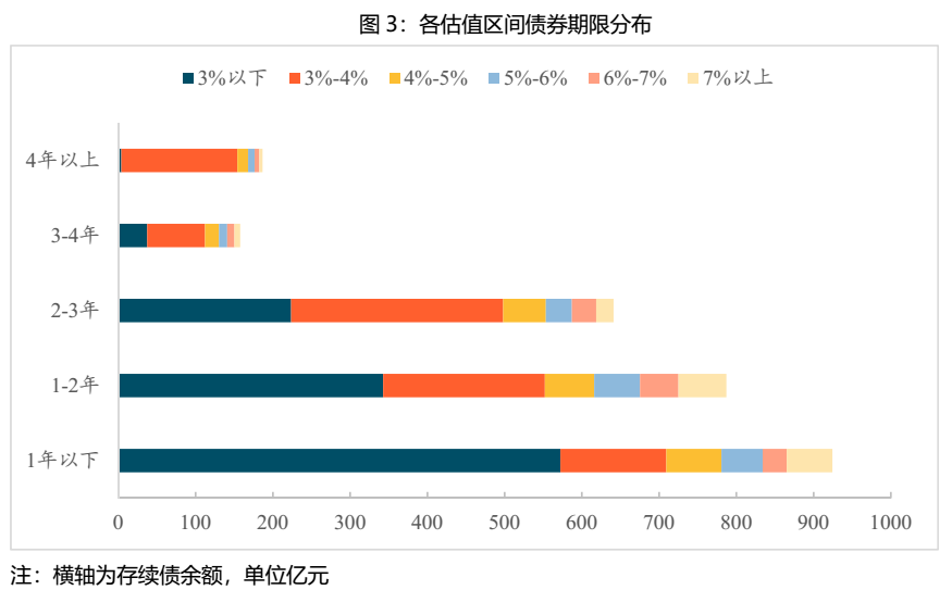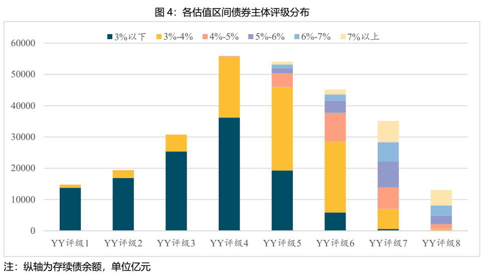 以2022年2月7日存續有估值(中債估值)債為基準,剔除違約主體債、剔除YY評級9-10的主體債、剔除期限在0.1以下債券作為債券池。按中債估值(若為行權債使用行權估值)劃分收益率區間,并對各區間收益率債券的分布做出統計描述。