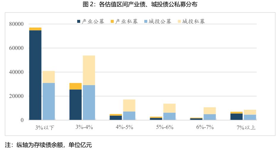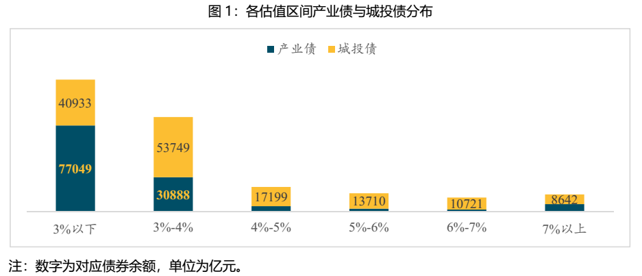 整體來看,城投債與產業債整體規模差距不是很大,但收益率區間差別較大,產業債中因大型央企發債較多,因此債券多在3%以下水平,偏利率屬性,其他估值區間中則多為城投債,也因此城投債更具有投資吸引力。