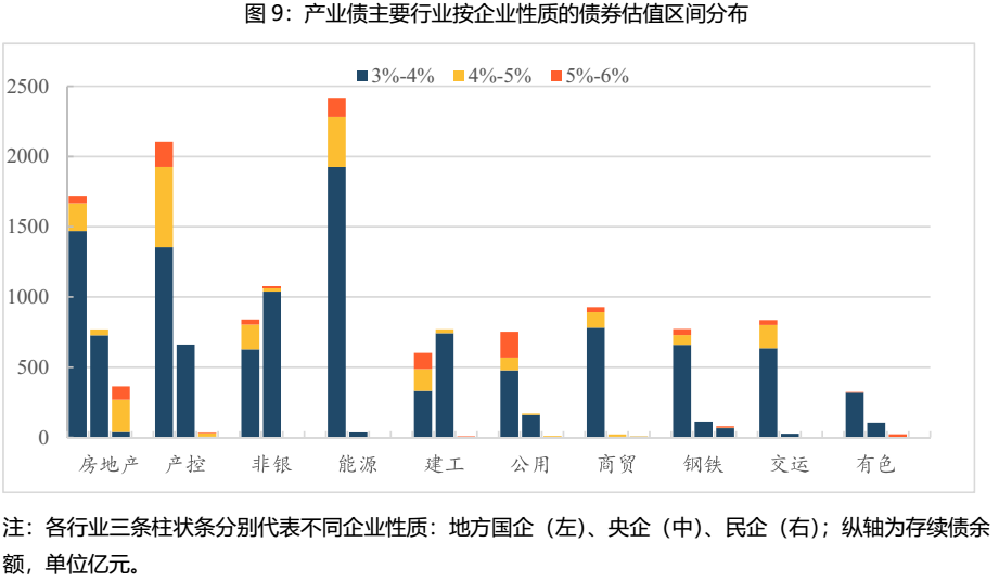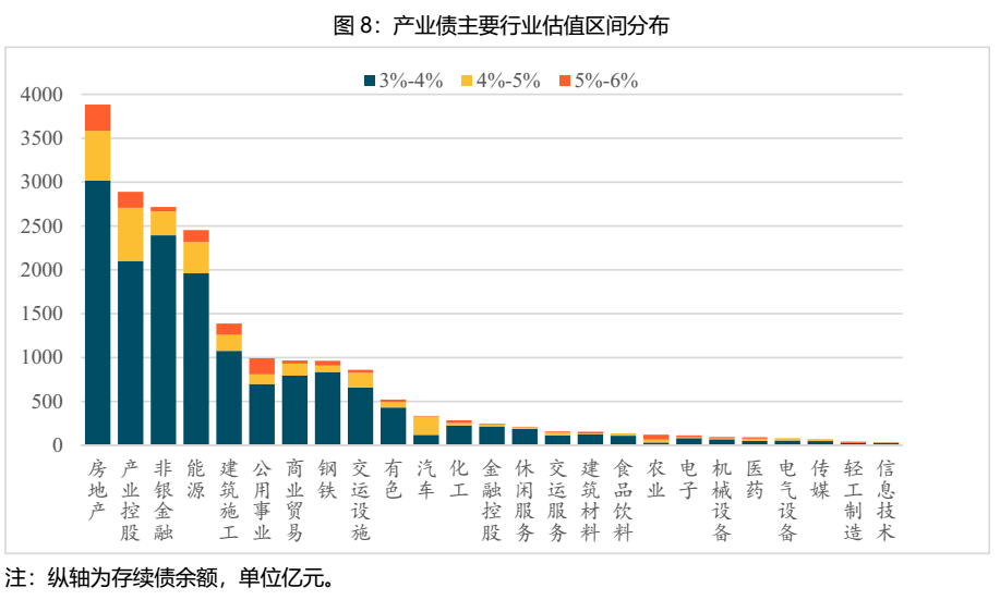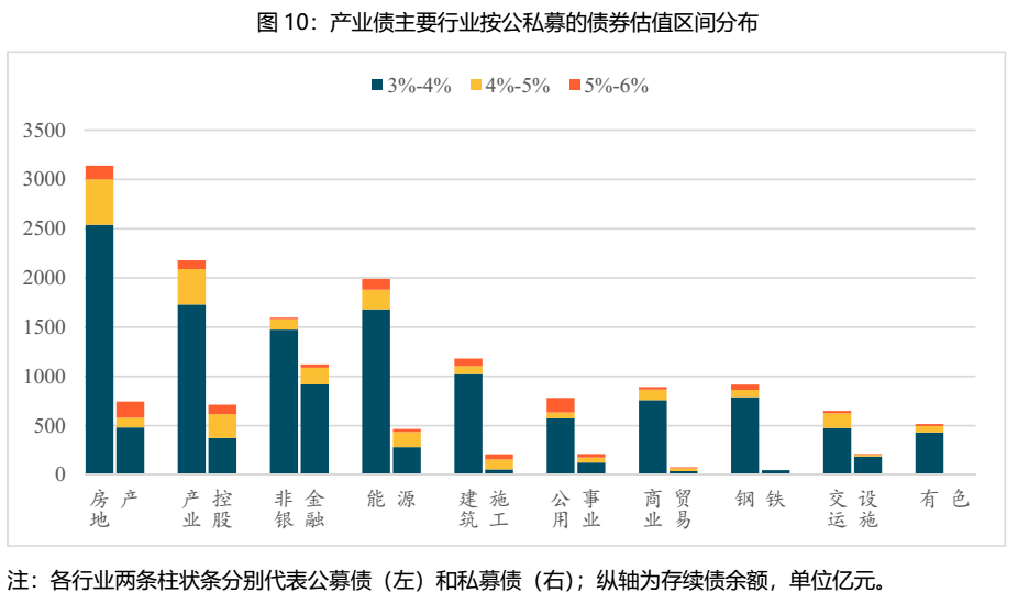 區分公私募債來看,不同于城投債,產業主體以公募債為主,私募債占比稍微高些的僅非銀行業(戴姆勒公司發行的PPN),其他行業如地產、產控、能源、建工等4%-6%估值區間的債券占比偏大;5%-6%的債券較多出現在地產公募及私募債、公用事業公募債。