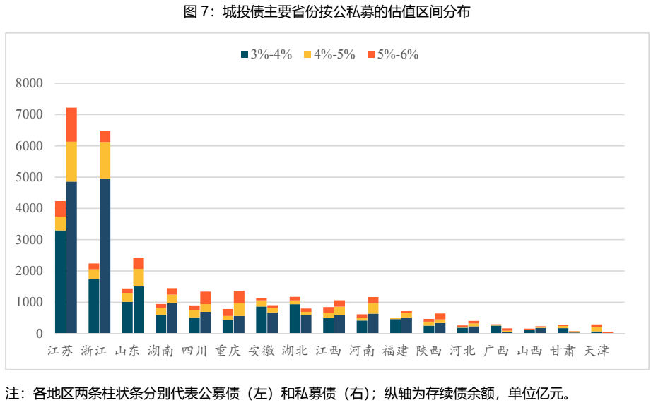 若區分公私募債,大多數地區以私募債為主,特別是浙江地區,3%-4%的私募債占據大部分份額;四川、重慶、河南、陜西等地私募債則多在4%以上,且四川、重慶5%-6%的債券占比偏大;天津地區則以公募債為主,且估值區間集中在4%-6%區間。