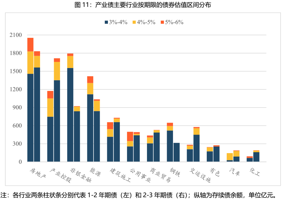分期限區間來看,各行業差異較大:地產行業債券整體期限分布較均勻,但5-6%債券在1-2年期間較多;產控、交運行業則以2-3年期債券為主;非銀則以1-2年期為主且3-4%區間收益率占比較高;建工、公用事業行業期限分布也較均勻,1-2期內4%以上債券規模稍大。