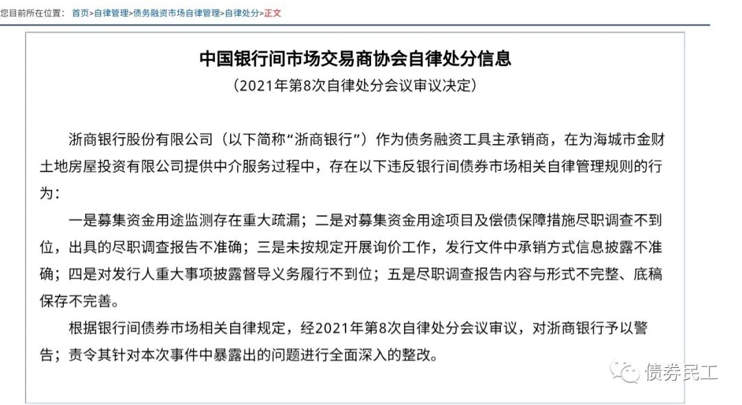 在此次自律處分之前,中國銀行間市場交易商協(xié)會于2021年4月6日公告,對浙商銀行啟動自律調(diào)查,主要原因是浙商銀行“對于發(fā)行人注冊發(fā)行文件涉嫌虛假記載等嚴重違規(guī)事項”,這次自律調(diào)查的起因是在“對相關(guān)發(fā)行人進行自律調(diào)查時”發(fā)現(xiàn)的,也就是線索可能直接來源于發(fā)行人。目前尚不清楚6月18日的這次自律處分的結(jié)果是否是交易商協(xié)會4月啟動自律調(diào)查的結(jié)果。