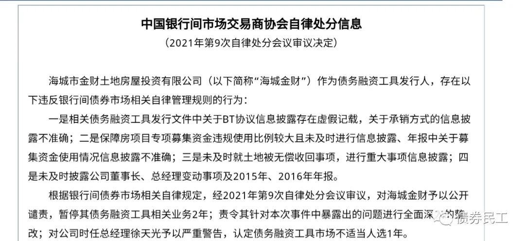 3、交易商協(xié)會對海城金財?shù)淖月商幏衷蛑饕荁T協(xié)議信息披露存在虛假記載、募集資金違規(guī)使用且未及時進行信息披露、未及時披露土地被無償收回事項、未及時披露董事長和總經(jīng)理變動及2015年和2016年年報。交易商協(xié)會對海城金財予以公開譴責、暫停債務(wù)融資工具業(yè)務(wù)2年;責令進行深入整改并對高管進行了自律處分。海城金財發(fā)行過多只企業(yè)債券、PPN和公司債券,目前存續(xù)債券“20海財01”,為私募債券產(chǎn)品,存續(xù)債券金額5億元。