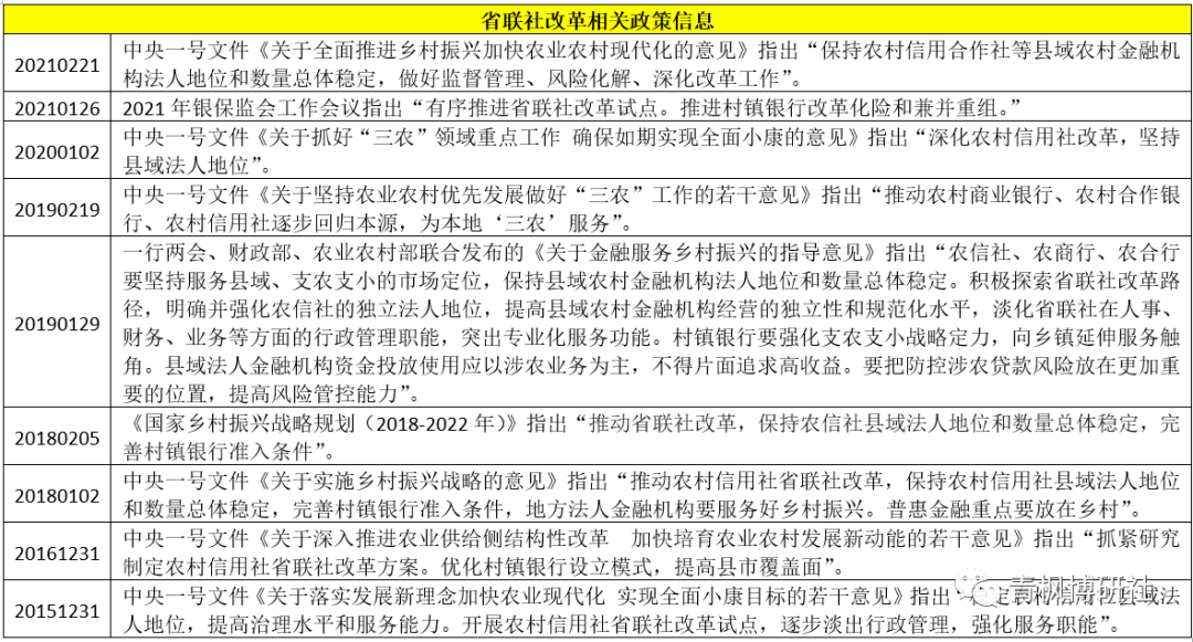 (1)2021年10月21日,銀保監會首席檢查官、辦公廳主任王朝弟在國新辦發布會上表示“繼續深化農信社改革已經提上日程……把深化省聯社改革與提高農信系統風險防控能力作為重點,因地制宜,按照‘一省一策’的原則,支持各小(區)從自身實際出發,制定切實可行的農信社改革方案……通過改革,能夠切實讓省聯社成為一個產權清晰、權責明確、政企分開、管理規范的現代化金融企業”,同時在該發布會上,王朝弟還透露絕大部分省份已經上報了深化農信社改革方案,且浙江省的農信社改革方案即將落地。