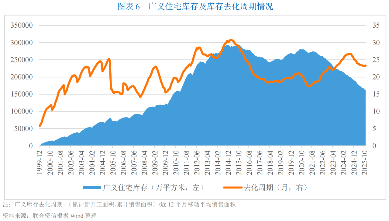 從銷售情況看,2025年1-11月,全國商品房銷售面積與銷售額分別為7.87億平方米和7.51萬億元,同比分別下降7.80%和11.10%,降幅較上年同期分別收窄6.50個百分點和8.10個百分點;但受政策利好效應衰減以及二手房持續降價等因素影響,銷售額降幅自4月以來持續擴大。2025年1-11月,全國商品房銷售均價為9546元/平方米,較上年同期下降3.43%。截至2025年11月底,全國商品住宅廣義庫存去化周期為23.34個月,自2024年9月出現下降拐點后持續下降,但目前趨于穩定;去庫存略顯成效,但庫存去化周期仍處高位,短期內去庫存仍是行業重點。