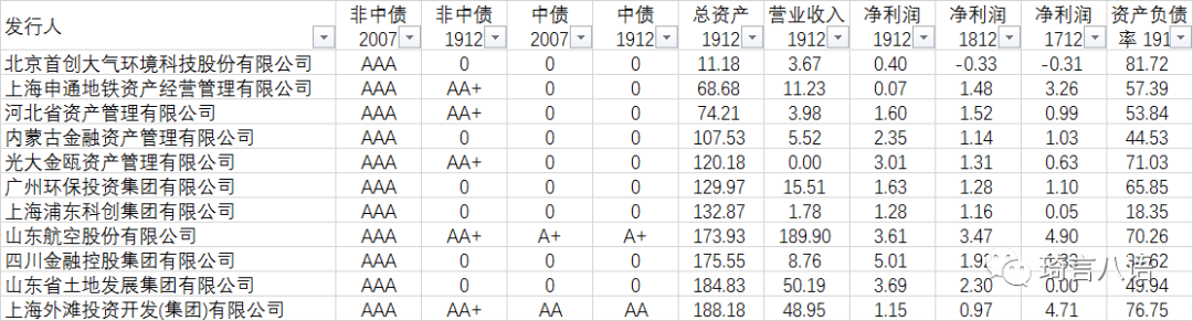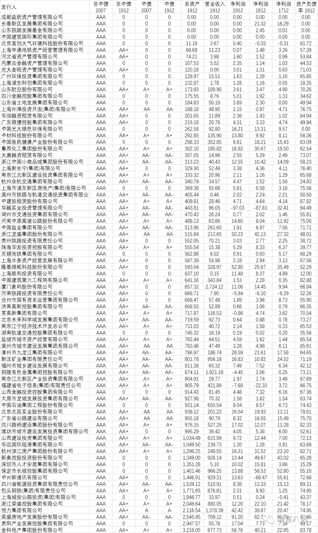可以看出,其中有多家企業(yè)的總資產(chǎn)不足二百億,甚至不到一百億,記得以前AA+的資產(chǎn)規(guī)模門檻都有二百億的:
