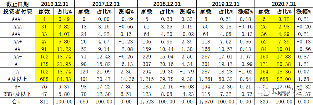 截至2020年7月31日,大公國際等發(fā)行人付費(fèi)的外部評(píng)級(jí)機(jī)構(gòu)的評(píng)級(jí)分布及變化情況如下: