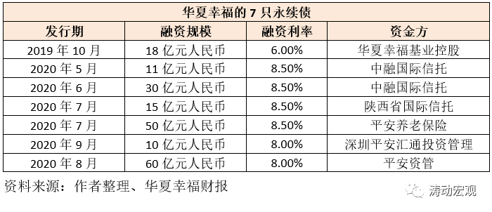 華夏幸福共有7只人民幣永續(xù)債,資金方共涉及平安、中融信托、陜西省國(guó)際信托以及其控股股東等主體。其中,6只永續(xù)債集中于2020年發(fā)行,中融信托向華夏幸福提供41億元人民幣融資(成本為8.50%)、平安系提供120億元人民幣融資(成本為8-8.50%)、陜西省國(guó)際信托提供15億元人民幣融資(成本為8.50%)以及華夏幸?;鶚I(yè)控股提供18億元人民幣融資(成本為6%)。