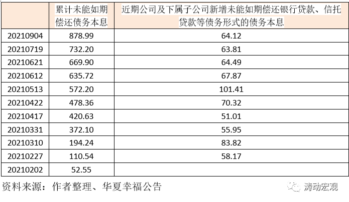 2、截至2021年9月4日,華夏幸福累計(jì)未能如期償還的債務(wù)本息為878.99億元,較今年2月的52.55億元已累計(jì)增加826.44億元。
