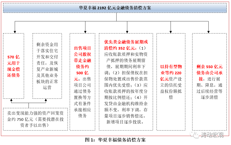 華夏幸福約2192億元的金融債務(wù)清償方案基本上堅(jiān)持“出售資產(chǎn)現(xiàn)金清償、債務(wù)跟隨項(xiàng)目走以及對(duì)部分債務(wù)進(jìn)行展期、下調(diào)利率、豁免罰息”的原則。
