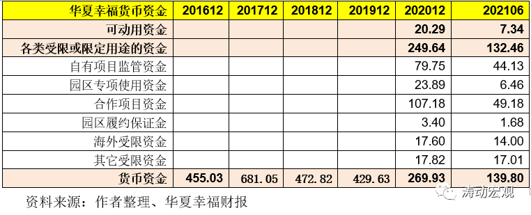 2018年以來(lái),華夏幸福的貨幣資金呈逐年加快下滑的態(tài)勢(shì),2017年貨幣資金余額為681.05億元,2018-2020年分別降至472.82億元、429.63億元和269.93億元,今年上半年進(jìn)一步降至139.80億元。不過(guò)華夏幸福的貨幣資金中,大多受限,如截至今年上半年,華夏幸??蓜?dòng)用的貨幣資金實(shí)際上只有7.34億元。