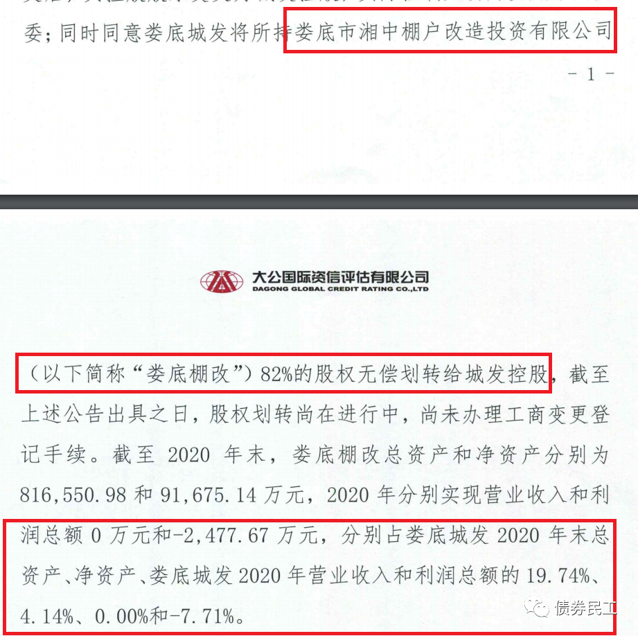 4、婁底市城市發展集團有限公司(主體信用評級為AA)公告,將公司持有的婁底市湘中棚戶區改造投資有限公司82%的股權無償劃轉給婁底市城市發展控股集團有限公司(控股股東為婁底市國資委)。