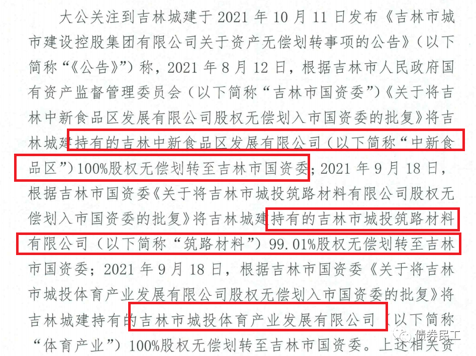 7、吉林市城市建設控股集團有限公司(主體信用評級為AA+)公告,將吉林中新食品區發展有限公司100%股權、吉林市城投筑路材料有限公司99.01%股權和吉林市城嘔吐體育產業發展有限公司100%股權,劃轉至吉林市國資委。