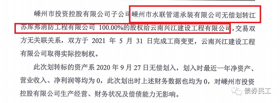 6、嵊州市投資控股有限公司(主體信用評級為AA+)公告,將子公司持有的江蘇庫弗消防工程有限公司100%的股權無償劃轉給云南興江建設工程有限公司(實際控制人為自然人)。不過該劃出的子公司凈資產、營業收入和凈利潤均為0。