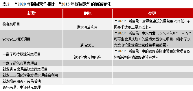 “2021年版目錄”與發(fā)改委此前參照的《綠色債券發(fā)行指引》相比,變化非常大,體現(xiàn)在項目的分類、項目的具體要求方面,建議有意發(fā)行綠色企業(yè)債的發(fā)行人仔細學習“2021年版目錄”。“2021年版目錄”與人民銀行、證監(jiān)會、交易所、交易商協(xié)會參照的“2015年版目錄”目錄的差異如表2所示。