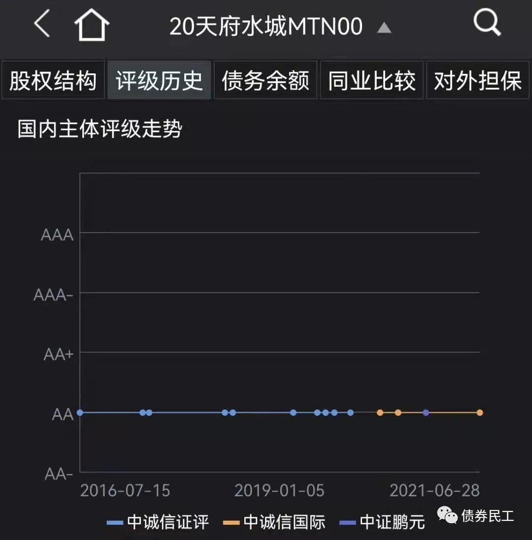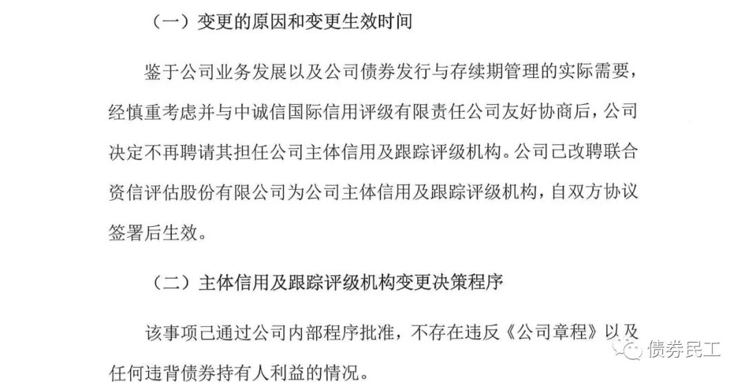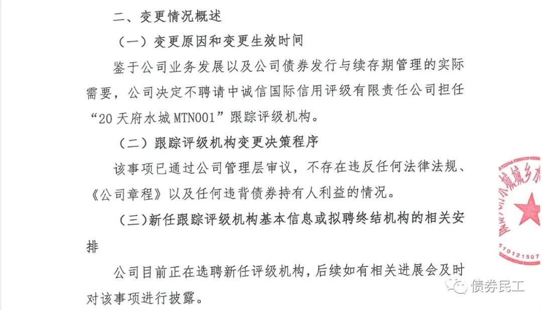 2、成都天府水城城鄉(xiāng)水務建設有限公司(以下簡稱“天府水城”)于2021年7月8日披露了《關于擬變更跟蹤評級機構和延期披露相關債券 2021 年跟蹤評級報告的公告》,“鑒于公司業(yè)務發(fā)展以及公司債券發(fā)行與存續(xù)期管理的實際需求”,不再聘任中誠信國際為跟蹤評級機構,但是天府水城目前尚未確認新的跟蹤評級機構。預計中誠信國際后續(xù)也會出具相應的公告。
