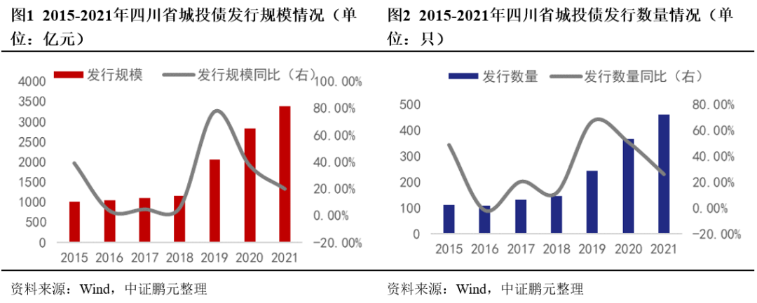 (1)四川省2021年城投債發債總量保持增長,但增速有所放緩,且區域分化明顯,成都市仍一城獨大。2021年四川城投發債規模和數量均較2020年有所增加但增速放緩。四川省城投債發行集中于成都市,且2021年成都市城投債發行仍然活躍,其余區域發債規模相對較小。