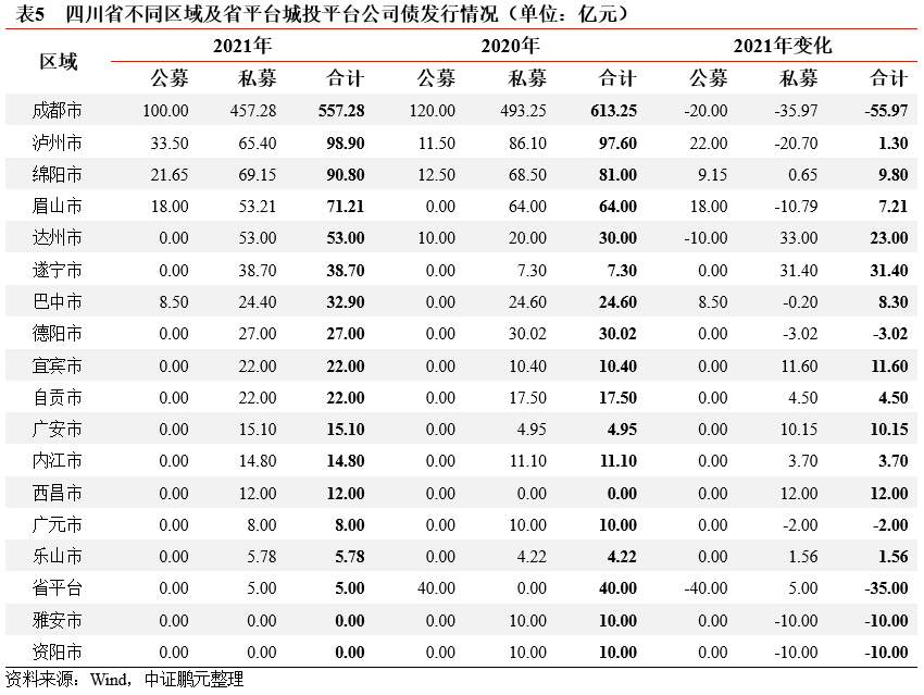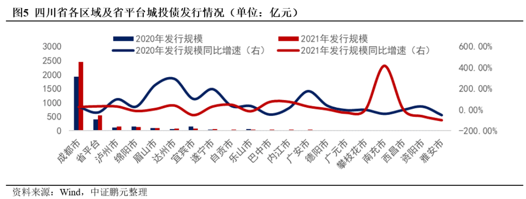 四川省城投債發行集中于成都市,且2021年成都市城投債發行仍然活躍,其余區域發債規模相對較小