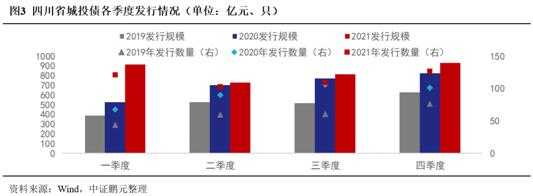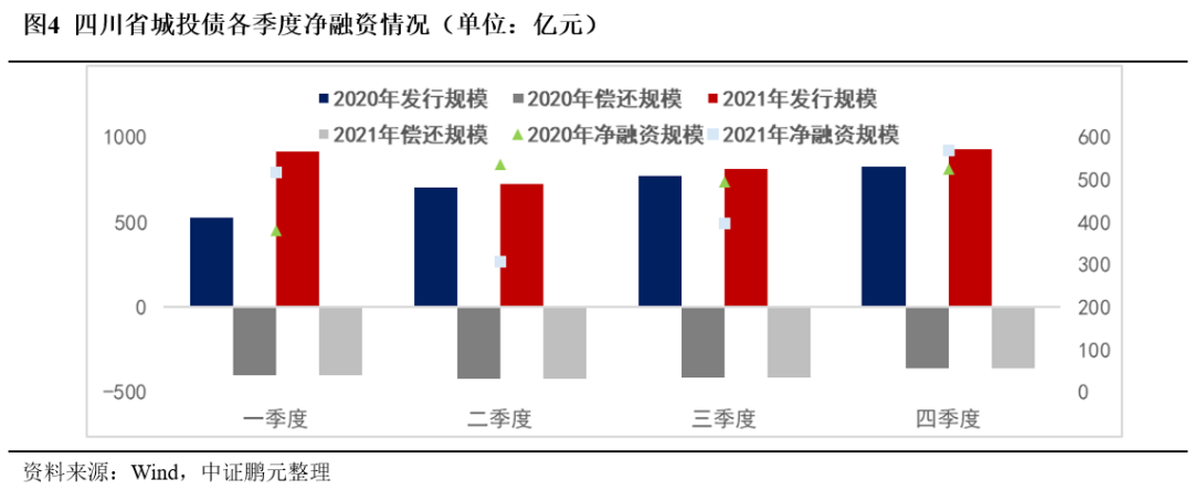2021年四川城投發債規模較2020年有所增加但增速放緩,凈融資額有所下降,同時季度波動明顯