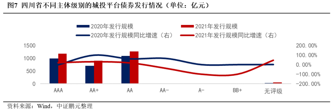 (2)2021年地市級、區縣級城投發行規模較大但增速下滑明顯,AA及AAA主體城投債發行最為活躍。2021年地市級及區縣級城投公司仍為四川省發債兩大主力,發債規模占比分別為31.73%、36.85%,但增速較2020年下滑明顯。2021年AA、AAA級別城投發債規模排名靠前。