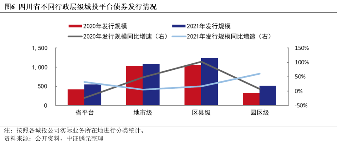 2021年地市級及區縣級城投公司仍為四川省發債兩大主力,發債規模占比分別為31.73%、36.85%。2021年地市級城投公司發行規模增速大幅下降至個位數,與區縣級城投公司發行規模差距拉大。受交易所對于弱資質或弱區域平臺公司的發債限制影響,2021年區縣級城投公司發債規模增速大幅下降,下降幅度高達85個百分點,但仍高于地市級公司發債規模增速。