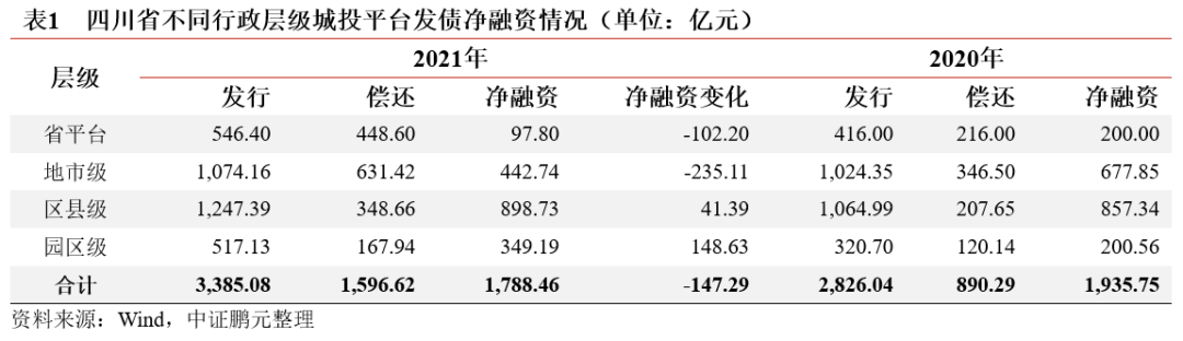 2021年地市級及區縣級城投債發行力度較大但增速下滑明顯,亦是凈融資的兩大主力