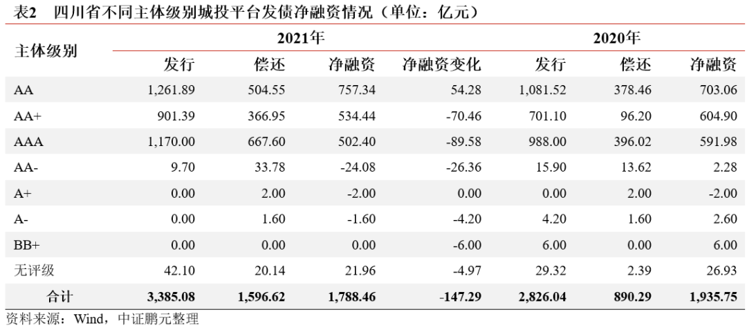 從不同級別的城投公司凈融資規模來看,2021年四川省AA級別城投凈融資貢獻最多且領先較多,其次是AA+和AAA,凈融資規模接近。從變動來看,除主體級別為AA的城投公司外,其他不同主體級別的城投公司凈融資同比均有不同程度的下滑。