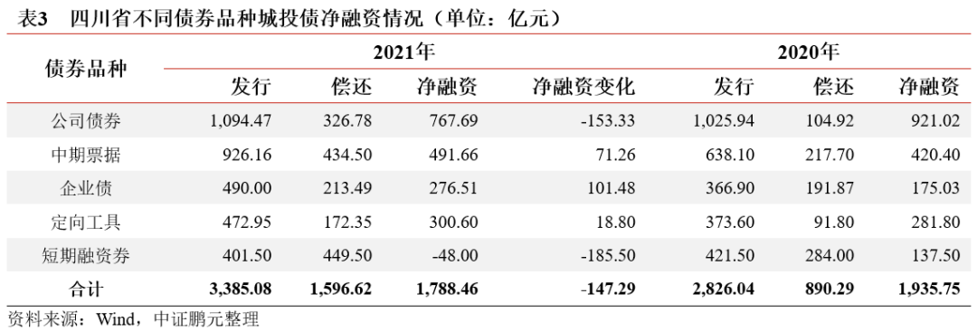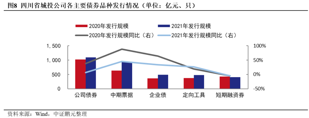 (3)2021年公司債凈融資出現收縮,中期票據及企業債發行情況較好,3-5年(含5年)債券品種發行規模居前但增速有所放緩。公司債仍為2021年四川省城投公司發債品種的主力,但凈融資出現收縮。中期票據、企業債凈融資規模落后于公司債,但保持增長趨勢。2021年3-5年(含5年)產品的發行規模占比接近50%,但增速有所放緩。