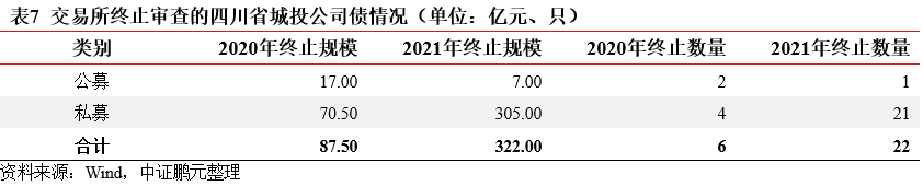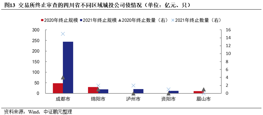 (5)交易所終止項目增長較快,四季度增長最為明顯,以私募債以及成都市城投公司居多。2021年交易所顯示為終止狀態的四川城投公司發行規模合計312.00億元,同比增長256.57%,4季度公司債終止項目發行規模和數量達到高峰。2021年私募債以及成都市城投公司終止規模和數量較多。