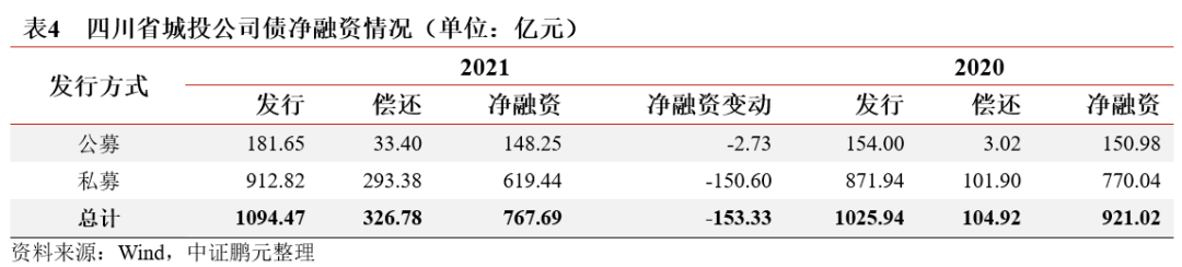 四川省城投公司主要發行私募債,2021年私募債發行規模雖增長但凈融資有所減少,其中成都市、瀘州市、綿陽市發行規模較大