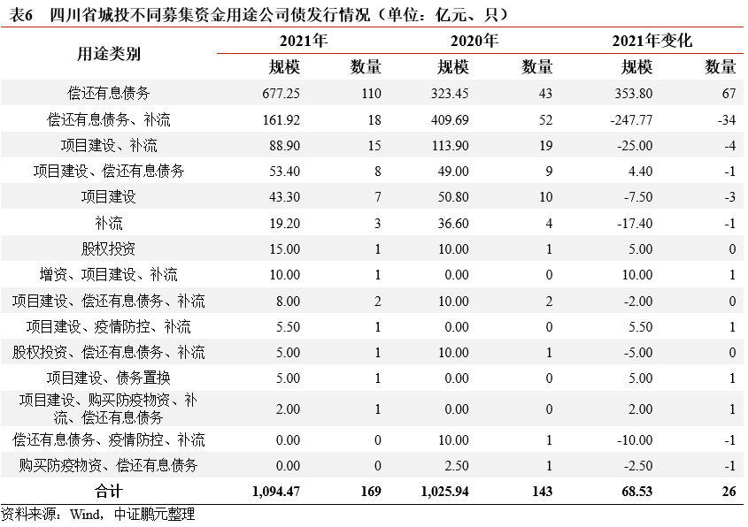 (4)四川省城投公司發行私募債居多,僅用于償還有息債務的債券占比大幅提升。四川省城投公司主要發行私募債,其中成都市、瀘州市、綿陽市發行規模較大;交易所公司債募集資金僅用于償還有息債務的城投債占比大幅提升且相對較高,項目建設類的城投債規模保持相對穩定。