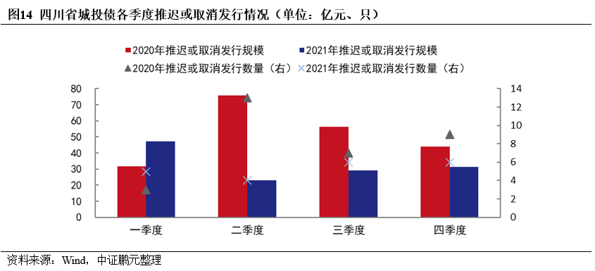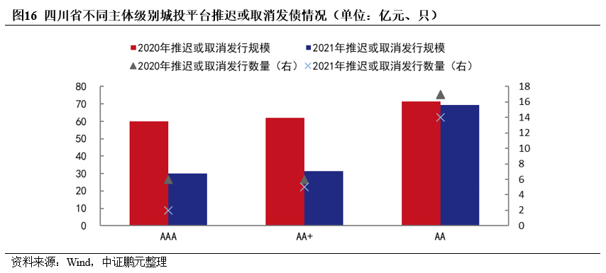 2021年四川省推遲或取消發行的城投債數量和規模較2020年均有下降,但集中在省平臺和成都市,AA主體推遲或取消發行情況較為多見