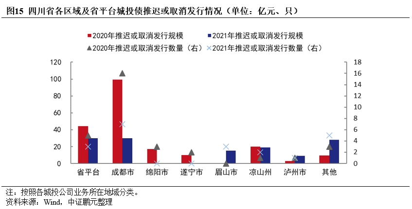 2021年四川省推遲或取消發行的城投債在地域分布上,主要來自成都市和省平臺,發行規模分別為29.80億元、30.00億元,數量分別為7只、3只。
