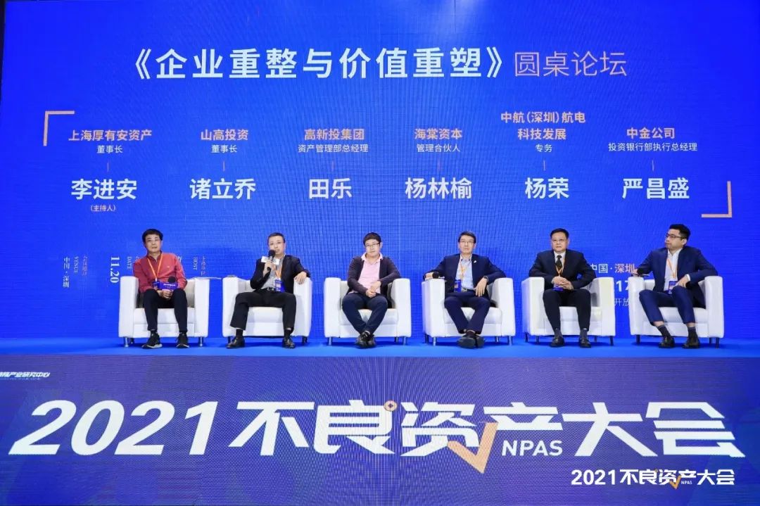 大會(huì)第一場圓桌:《企業(yè)重整與價(jià)值重塑》由上海厚有安資產(chǎn)董事長李進(jìn)安主持,與山高投資董事長諸立喬 、高新投集團(tuán)資產(chǎn)管理部總經(jīng)理田樂、海棠資本管理合伙人楊林榆、深航電專務(wù)楊榮、中金公司投資銀行部執(zhí)行總經(jīng)理嚴(yán)昌盛一起對話。