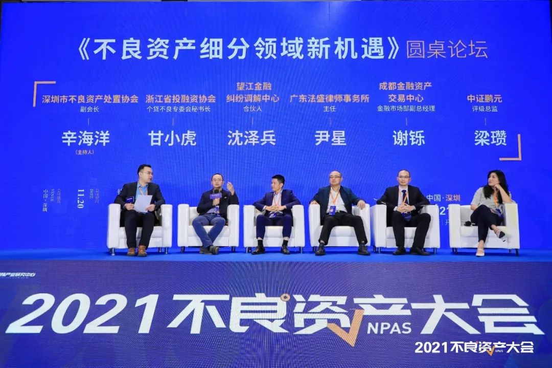 大會(huì)最后一場圓桌《不良資產(chǎn)細(xì)分領(lǐng)域新機(jī)遇》,由深圳不良資產(chǎn)處置協(xié)會(huì)副會(huì)長辛海洋主持,與浙江省投融資協(xié)會(huì)個(gè)貸不良專委會(huì)秘書長甘小虎、望江金融糾紛調(diào)解中心合伙人沈澤兵、廣東法盛律師事務(wù)所主任尹星、成都金融資產(chǎn)交易中心金融市場部副總經(jīng)理謝鑠、中證鵬元評級總監(jiān)梁瓚一起對話。