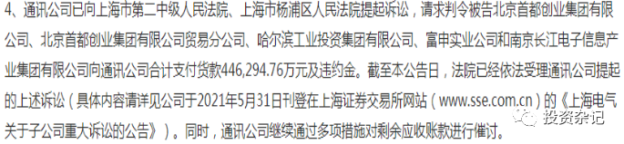 第五,欠款的來頭也不小,單純書面研究也不清楚為啥拖欠賬款。根據公司公告,前幾大欠款方來頭都比較大,除了富申實業公司是民企外,首創集團是北京的大國企,哈爾濱工業投資集團是哈爾濱當地國企,南京長江電子信息產業集團是中電熊貓的子公司(在往上追溯是中國電子,實際控制人是國務院國資委)。民企欠錢也就罷了,如果這種大國企、大央企在正常的商業往來中也欠錢是有點不可思議。所以有種可能就是這些央企、國企被騙了,根本不存在底層的商業交易。