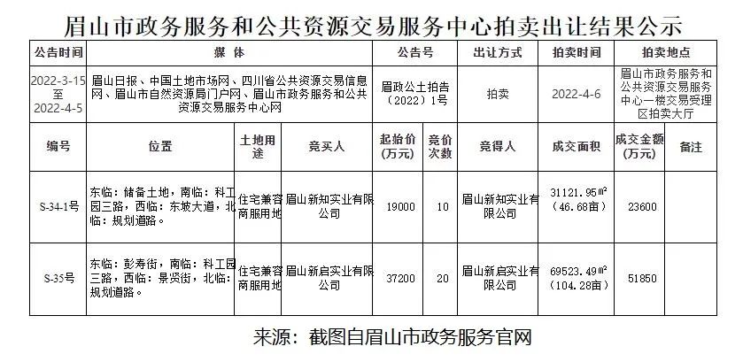 兩位買家為眉山新知實業有限公司,為眉山新啟實業有限公司。企查查顯示這兩家公司均為眉山市國資平臺100%持股。