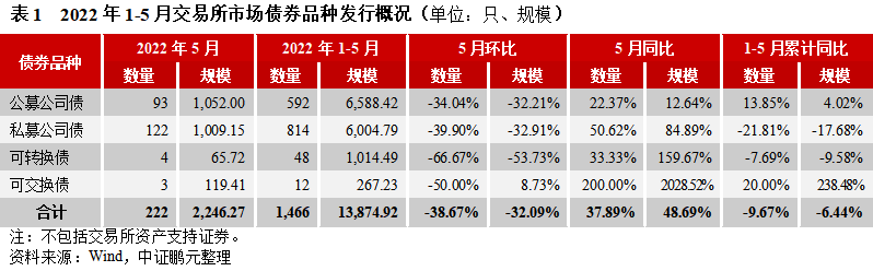 2022年5月份,交易所市場共發行信用債券222只,發行規模2,246.27億元,分別環比分別下降39%和32%,同比分別增長38%和49%。具體而言,5月份,公募公司債發行93只、發行規模1,052.00億元,環比分別下降34%和32%,同比分別增長22%和13%;私募公司債發行122只、發行規模1,009.15億元,環比分別下降40%和33%,同比分別增長51%和85%。可交換債和可轉換債方面,5月份可轉債發行數量和發行規模分別環比下降67%和54%,可交換債發行數量和發行規模環比分別下降50%和增長9%。