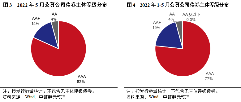 綜合2022年1-5月份的情況來看,主體級別仍以中高等級為主,AAA級、AA+級、AA級主體評級占比分別為39%、35%、26%。其中,公募公司債AAA級、AA+級、AA級主體評級占比分別為77%、19%、4%;私募公司債AAA級、AA+級、AA級及AA-及以下主體評級占比分別為11%、47%、41%、1%。
