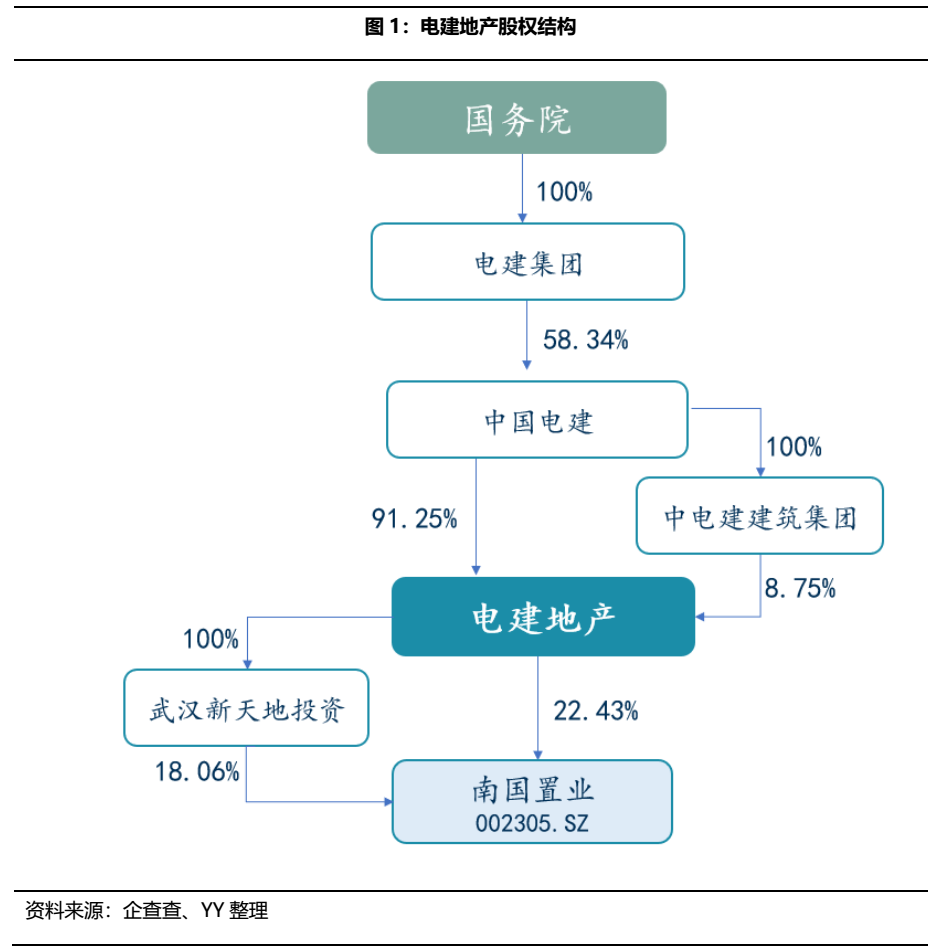 2005年11月,作為首批獲得國資委核定的16家主營(yíng)房地產(chǎn)開發(fā)與經(jīng)營(yíng)業(yè)務(wù)的央企,中國電建地產(chǎn)集團(tuán)有限公司(以下簡(jiǎn)稱“電建地產(chǎn)”)重組成立。電建地產(chǎn)是中國電力建設(shè)股份有限公司(以下簡(jiǎn)稱“中國電建”)房地產(chǎn)業(yè)務(wù)的核心子公司,國資委通過中國電力建設(shè)集團(tuán)有限公司(以下簡(jiǎn)稱“電建集團(tuán)”)間接持有電建地產(chǎn)58.34%的股份,為公司實(shí)際控制人。電建地產(chǎn)旗下持有上市公司南國置業(yè)股份有限公司(以下簡(jiǎn)稱“南國置業(yè)”)。