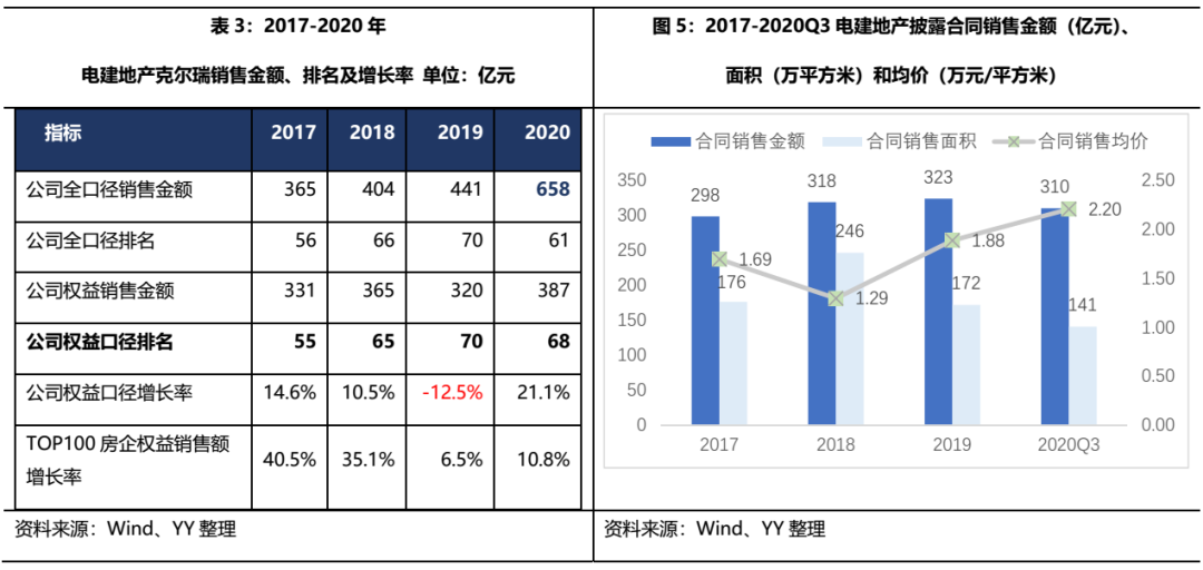 銷售方面,與行業(yè)水平相比,電建地產(chǎn)2017-2019年全口徑和權(quán)益口徑銷售金額排名均有所滑坡,銷售增速也低于TOP100房企的行業(yè)平均水平,但隨著公司2020年下半年開始發(fā)力,各項(xiàng)銷售指標(biāo)有所提升,公司2020年權(quán)益口徑銷售金額增長(zhǎng)217億元。