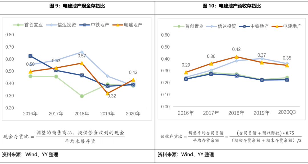 存貨去化方面,2019年以后公司回款和預(yù)售情況均滑坡較多,疊加2020年疫情湖北受重創(chuàng),整體毛利率2020年也跌破正值,去化壓力較大。從現(xiàn)金存貨比觀測(cè)回款情況,公司2019年及2020Q3回款惡化,主要是公司加大了合作開發(fā)力度,且回款進(jìn)度放緩。從預(yù)收存貨比觀測(cè)預(yù)售情況,公司近五年基本維持在30%以上,2019年以來下降明顯,但整體預(yù)售情況好于資質(zhì)和規(guī)模相近的中鐵地產(chǎn)和首創(chuàng)置業(yè)。