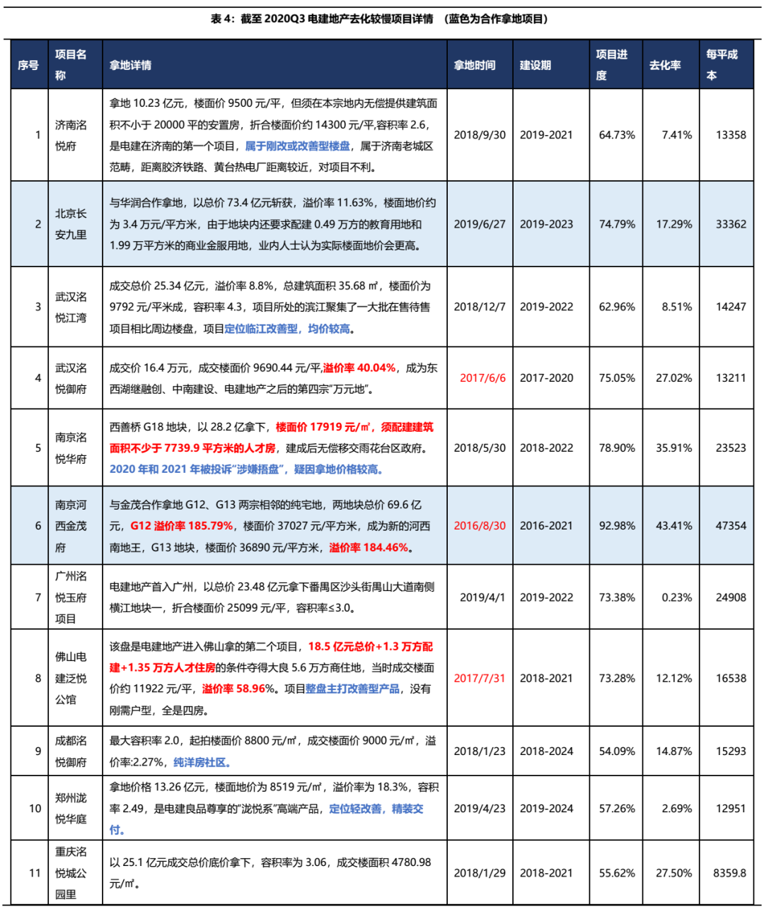 具體來看去化較慢的項(xiàng)目,公司不乏高溢價(jià)拿地項(xiàng)目,尤其是在2016-2017年拿地價(jià)格普遍較高(序號(hào)4、6、8),南京洺悅?cè)A府更是兩度被投訴“涉嫌捂地”。此外,去化不暢的部分項(xiàng)目主打住房改善或型產(chǎn)品,均價(jià)較高。整體看來,拿地成本高+產(chǎn)品定位輕改善,是公司住宅項(xiàng)目去化慢的重要原因,未來大規(guī)模的存貨去化將使公司面臨挑戰(zhàn)。