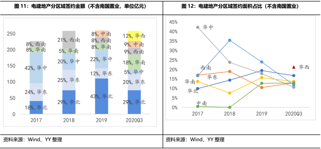 公司近四年簽約銷售金額增長(zhǎng)較為平緩,銷售區(qū)域分布朝著“全國范圍內(nèi)更加合理均衡的戰(zhàn)略布局”調(diào)整。截至2020Q3,簽約金額占比較高的區(qū)域?yàn)槿A北29%、華東20%和華南18%,簽約面積貢獻(xiàn)較多的是華西21%、華北17%和華南14%,整體區(qū)域集中度較低,能夠較好的分散區(qū)域政策風(fēng)險(xiǎn)。
