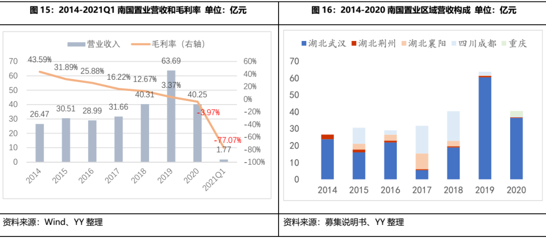 南國置業(yè)自2014年起營(yíng)收規(guī)模有所增長(zhǎng),但盈利能力持續(xù)下跌,并購后業(yè)務(wù)開展不暢,疫情打擊雪上加霜。如圖16,被吸并之后南國置業(yè)的毛利率一路下探,2019年毛利率已經(jīng)低至3.37%,業(yè)務(wù)收入在2014-2018年也只能算是平緩增長(zhǎng),2019年?duì)I收沖高,但從盈利情況看業(yè)務(wù)擴(kuò)張并不順利,而2016-2019年武漢市房?jī)r(jià)處于加速上升期,顯然南國置業(yè)的經(jīng)營(yíng)層面出現(xiàn)了問題,而在新冠疫情的沖擊下,重倉武漢的南國置業(yè)2020年更是慘淡。