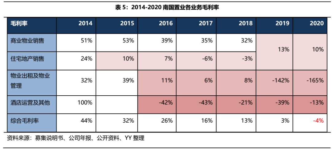 分別考察各業(yè)務(wù)板塊毛利率,發(fā)現(xiàn)公司的商業(yè)物業(yè)銷售業(yè)務(wù)運(yùn)作整體比較健康,但營(yíng)收占比較大的住宅地產(chǎn)銷售連年保持低毛利,物業(yè)出租和酒店運(yùn)營(yíng)雖然收入貢獻(xiàn)有限,但虧損更為嚴(yán)重。