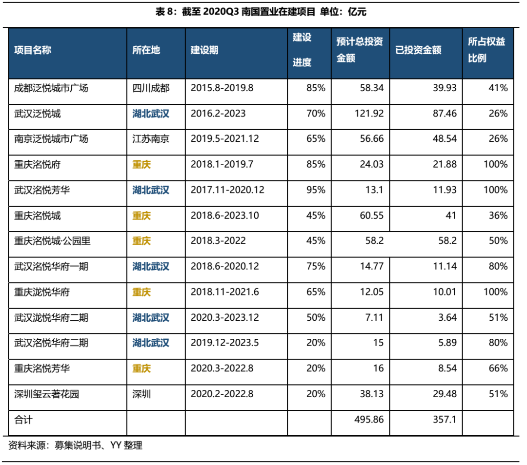 截至 2020 年 9 月底,南國置業(yè)現(xiàn)有在建項(xiàng)目共13個(gè),主要集中在武漢(5個(gè))、重慶(5個(gè))等城市,區(qū)域集中度仍然很高;從權(quán)益占比來看,公司開始加大合作拿地力度,也在尋找新的突破路徑;依據(jù)所占權(quán)益比例,六個(gè)項(xiàng)目剩余擬投資金額敞口共計(jì) 62.54 億元。
