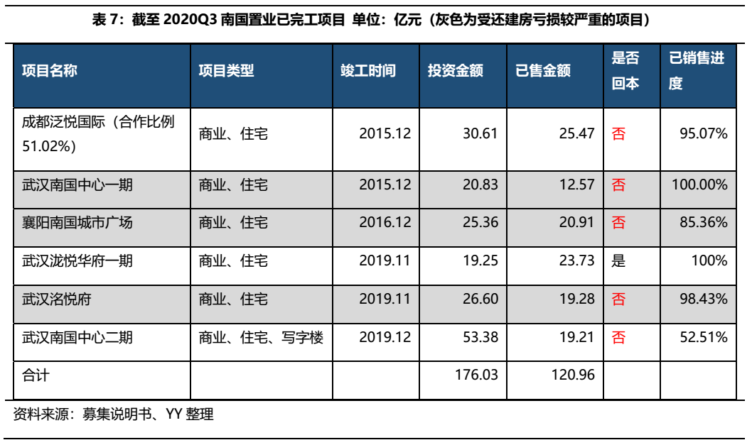 截至2020年9月底,南國置業(yè)公布的6個(gè)已完工項(xiàng)目,4個(gè)項(xiàng)目在武漢,其中5個(gè)項(xiàng)目均未收回投資成本,以當(dāng)前的銷售金額和進(jìn)度來看,即使未售罄項(xiàng)目售完也很難覆蓋投資金額,六個(gè)項(xiàng)目已投資累計(jì)176.03億元,已售金額僅累計(jì)120.96億元。