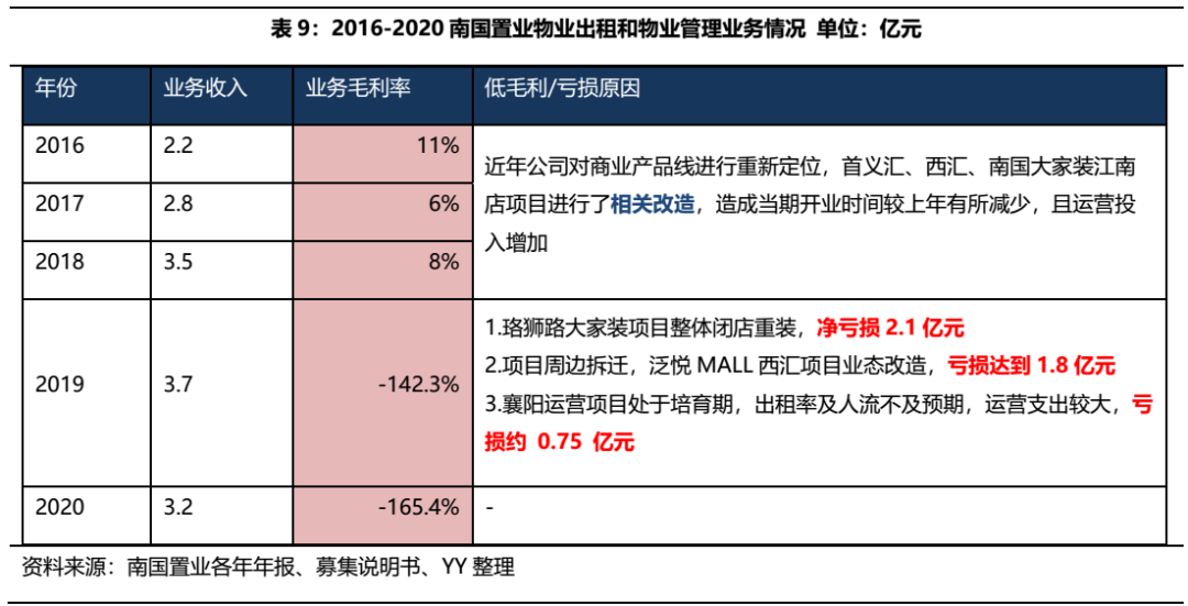 物業(yè)出售業(yè)務(wù)方面,2016-2019年公司對(duì)旗下商業(yè)產(chǎn)品線進(jìn)行了大規(guī)模的改造,期間內(nèi)物業(yè)出售及物業(yè)管理板塊的毛利率一直很低。2019年公司披露珞獅路大家裝項(xiàng)目、泛悅MALL西匯項(xiàng)目主要改造項(xiàng)目虧損合計(jì)3.9億元,而當(dāng)年物業(yè)出租板塊業(yè)務(wù)收入僅為3.7億元,業(yè)態(tài)調(diào)整確實(shí)為虧損的直接原因,而2020年在疫情的沖擊更是雪上加霜。
