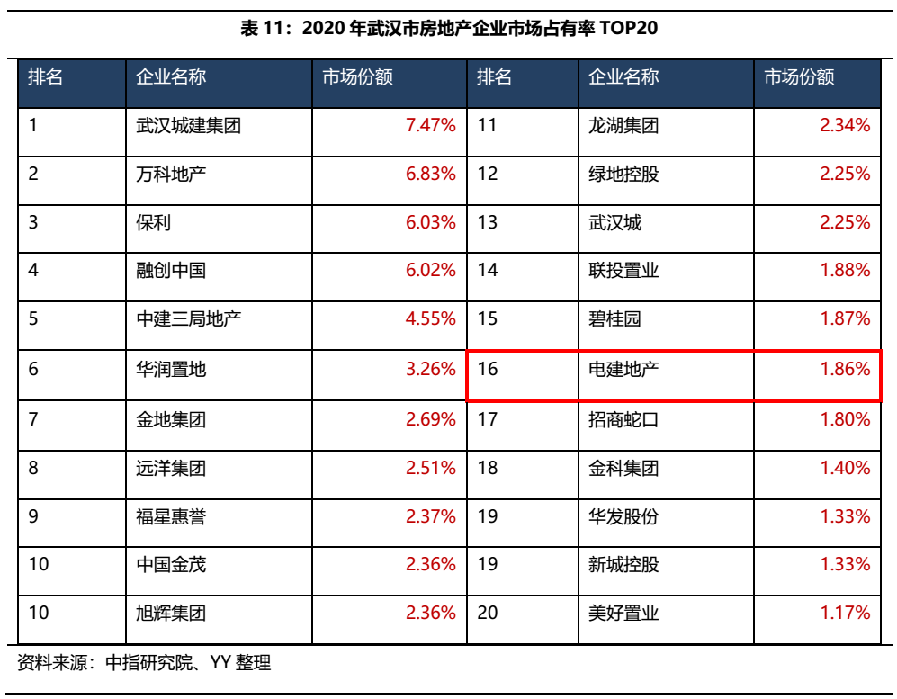 從市場(chǎng)競(jìng)爭(zhēng)格局來看,2020年武漢城建集團(tuán)、萬科和保利市場(chǎng)占有率位居前三,而電建地產(chǎn)排名第16位,市場(chǎng)份額為1.86%。在全面壓降住宅容積率、樓市競(jìng)爭(zhēng)不斷加劇、政策由寬從嚴(yán)的大背景下,面對(duì)連續(xù)兩年的業(yè)績(jī)大幅下挫,南國置業(yè)未來想在大本營(yíng)武漢保有一席之地也并非易事。